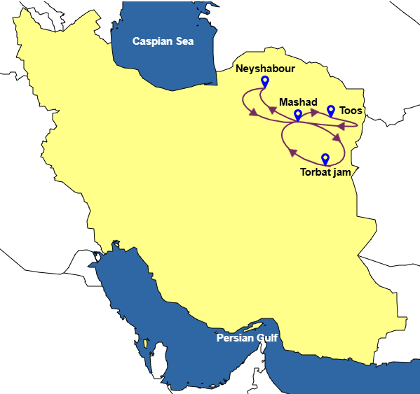 After breakfast drive to Torbat-e jam 167 km . when we reach to the city first we will visit Sheikh Ahmad–e Jām Khaneghah and Mausoleum Complex (Mazar–e Jām)he was one of the great Iranian Sufis in the second half of the forth and first half of the fifth century AH. The presence of sheikh and his descendants played a major role in the development of the region, particularly Maˈd Ābād village and its turning into Torbat-e Jām town. Here he built a Khaneghah for teaching and preaching to his followers so that the village became a venue for pilgrims and devotees, which caused its flourishing. The respect for his Gnostic personality led to the construction of more buildings at his shrine and the extension of this Khaneghah regarding its beauty, magnificence and greatness. After training many disciples and attaining the highest mystical and divine authority he passed away in the year 536 AH.The tomb complex of Sheikh Ahmad Jām, which is the result of developments in various historical periods, includes numerous works from the Seljuk, Al-Kurt, Timurid, Safavid, and Qajar periods. In this shrine, architectural elements are formed around a large central courtyard. The most important and magnificent architectural spaces of the site have been constructed adjacent to Sheikh Jām’s tomb including a dome, a porch, a mosque of Kermani, a white dome and a green dome, a porch, a mosque, Jāme mosque, open mosque (summer and winter), water storage, Madras (school), entrance hall . we will listen to Dotar playing by Maestro Hussein Daman pak and learn how he make this musical instrument .Dotar is one of the oldest instruments of Iranian music, and one of the most important stringed instruments – folkloric wounds of rural and urban communities in the country registered in unesco list lunch after lunch drive to saffron farm ( BASE ON SEASON) to visit how saffron plant and back to mashad .O/N