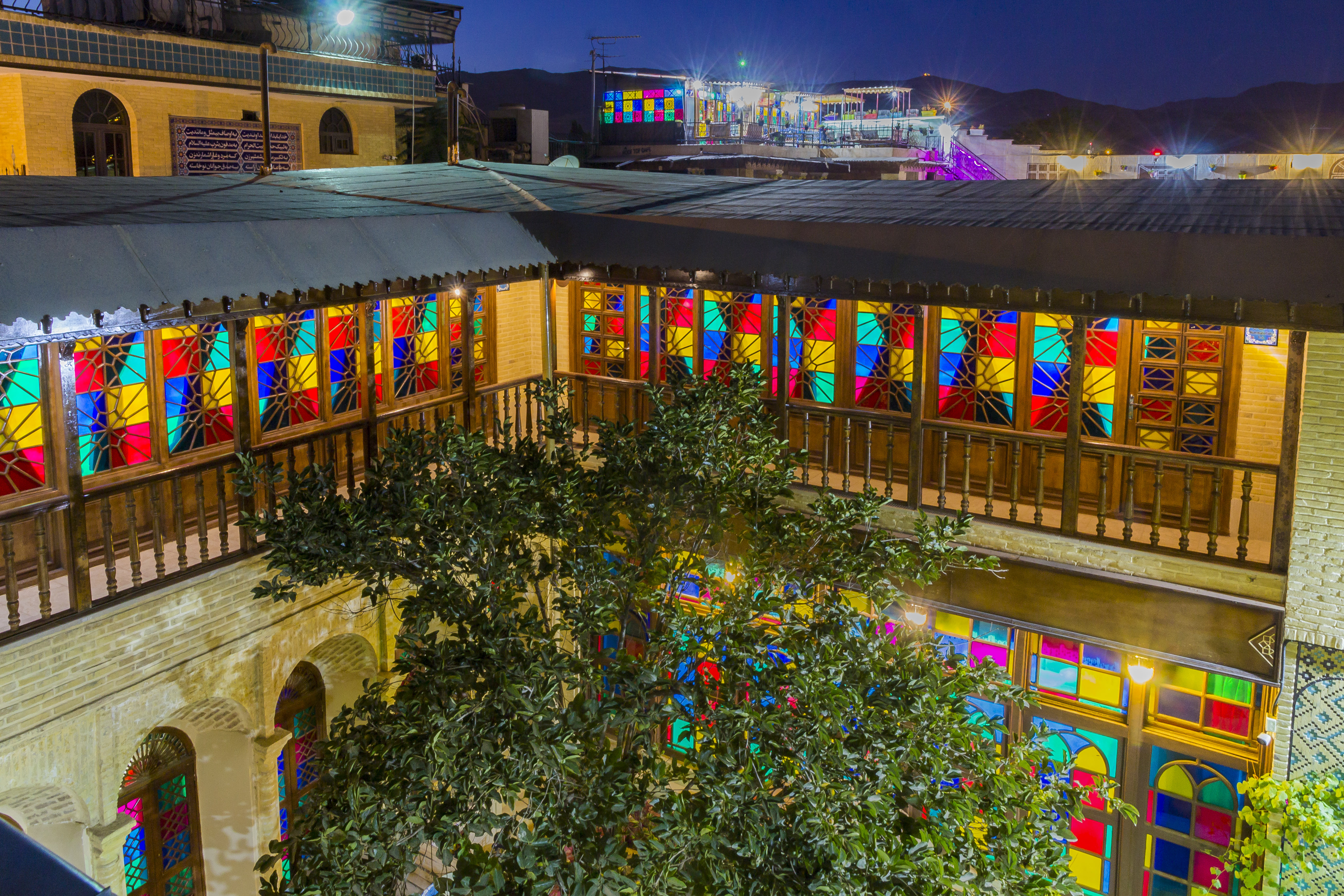 Niayesh Hotel is located in a historical and cultural region of Shiraz. This Hotel is a chain of ten registered plaques in the form of seven buildings stretching from the beginning of 4/3 Alley on Dastgheib Street to 7 Shahzadeh Jamali Alley. It has 3 restaurants, 3 coffee shops, an art gallery, a leather workshop, a central kitchen, a laundry, and a concierge, serving guests in 6 courtyards and up on 2 roofs featuring a relaxed atmosphere with impressive views.